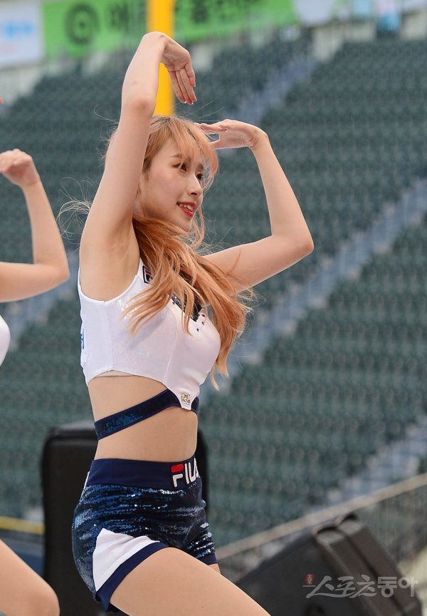 두산 치어리더가 응원단상에서 공연을 펼치고 있다.
