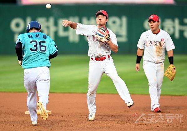 4회초 1사 1, 2루에서 NC 나성범의 내야 땅볼 때 SK 김성현이 1루 주자 권희동이 2루에서 포스 아웃시킨 뒤 1루로 송구하고 있다.