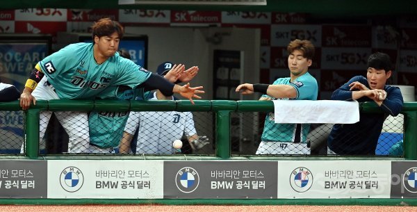 5회초 무사에서 NC 양의지의 파울 타구를 더그아웃의 박석민이 수비하고 있다.