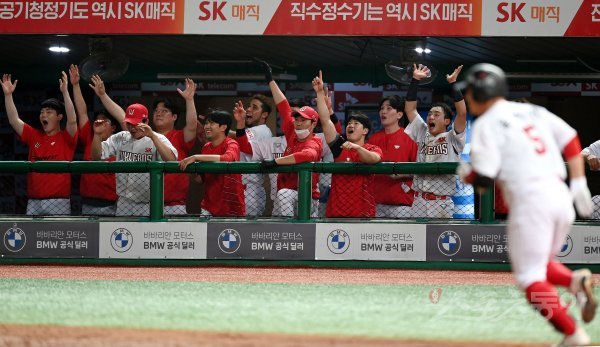 6회말 1사 1루에서 SK 윤석민이 동점 투런 홈런 때 선수들이 더그아웃에서 환호하고 있다.
