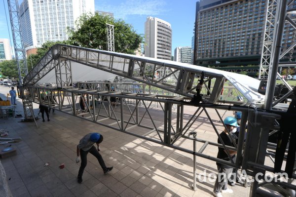 10일 오후 서울 중구 시청 앞 광장에 고(故) 박원순 서울시장의 분향소가 설치되고 있다.