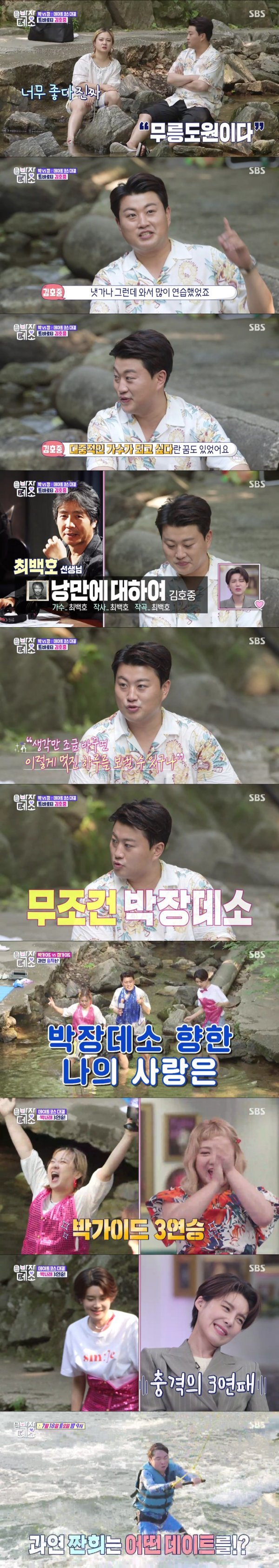 박나래는 계곡을 바라보는 식당에서 김호중을 위한 보양식을 준비해 시선을 끌었다. 고추장삼겹살에 한방 백숙, 얼음 막걸리까지 준비한 나래표 수라상에 김호중은 “나 왕이 된 것 같아요”라면서 감동했다. 그는 “나 집에 못 간드아~”며 시종일관 폭발적인 성량의 노래로 화답하는가 하면, 군침 자극하는 ‘닭발골쇼’를 선보이며 만족감을 표현했다. 이를 지켜보던 박아인은 "나래 씨를 만나러 온 게 아니라 닭다리를 만나러 온 것 같다"라고 하자 장도연은 "지금 닭이랑 데이트하고 있다"라고 언급해 웃음 바다가 되었다. 또 나래가 장가이드랑 오전 데이트는 어땠냐 질문에는 호중이 “장가가 누구예요?”라며 천연덕스럽게 대답해 도연을 흥분시키기도 했다.