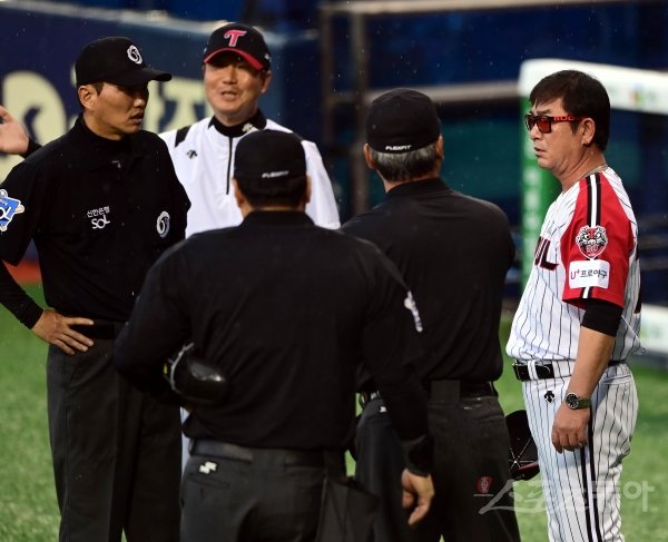 12일 서울 잠실야구장에서 ‘2020 신한은행 SOL KBO리그’ LG 트윈스와 NC 다이노스의 경기가 열렸다. 1회말 시작 직전 우천 중단되자 LG 류중일 감독이 심판진에게 항의하고 있다.