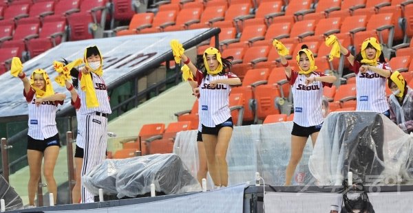 12일 서울 잠실야구장에서 ‘2020 신한은행 SOL KBO리그’ LG 트윈스와 NC 다이노스의 경기가 열렸다. LG 치어리더들이 비를 맞으며 응원을 하고 있다.