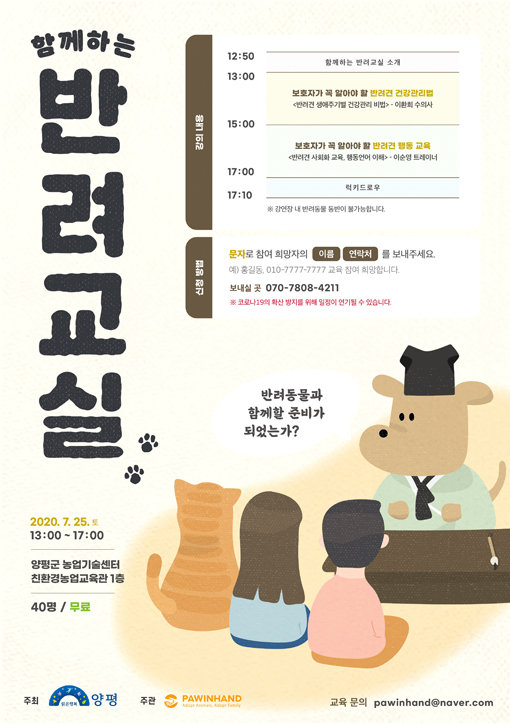 ‘함께하는 반려교실’의 첫 교육은 7월25일 양평군 농업기술센터 친환경농업교육관 1층에서 진행될 예정이다. 코로나19의 여파로 신청자를 40명으로 제한해 받고 있으며, 신청은 참여 희망자의 이름과 연락처를 보내면 된다.