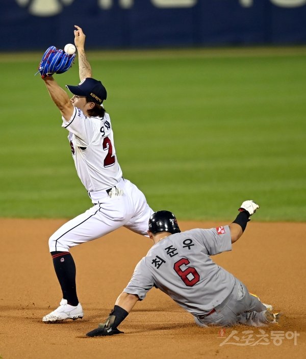 14일 서울 잠실야구장에서 ‘2020 신한은행 SOL KBO 리그’ SK 와이번스와 두산 베어스의 경기가 열렸다. 6회초 무사 1루 SK 3루수 앞 땅볼 때 두산 오재원이 송구 실책 된 공을 놓치고 있다.