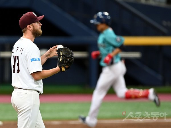 5회초 무사 1, 3루에서 NC 노진혁에게 3점 홈런을 허용한 키움 선발 요키시가 아쉬워하고 있다.