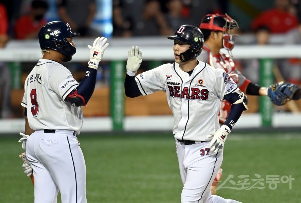 5회말 무사 두산 박건우가 역전 중월 솔로 홈런을 날리고 그라운드를 돌아 홈인해 하이파이브 하고 있다.