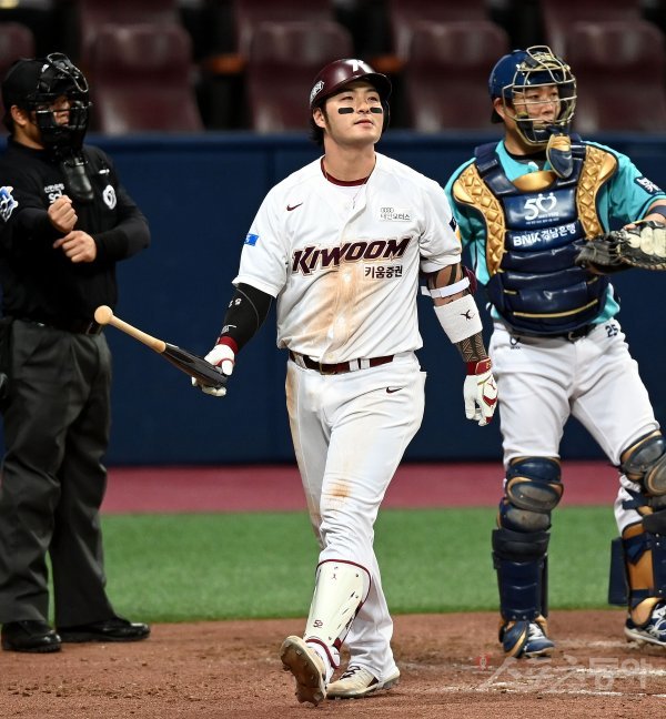 7회말 1사 1, 2루에서 키움 박병호가 삼진 아웃으로 물러나고 있다.