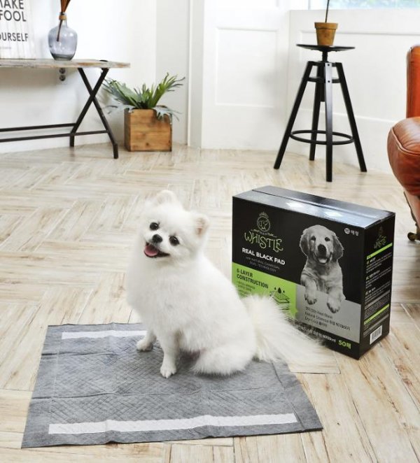애경산업 휘슬의 ‘리얼블랙배변패드’에 앉아있는 반려견. 사진제공 l 애경산업 휘슬