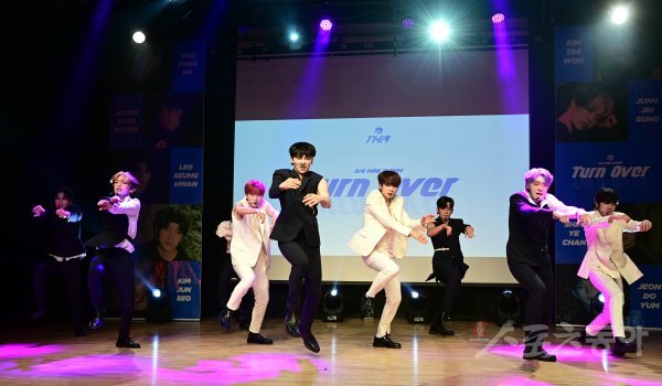 그룹 원더나인(1THE9)이 16일 서울 강남구 청담동 일지아트홀에서 열린 세 번째 미니앨범 ‘Turn Over(턴 오버)’ 컴백 쇼케이스에서 타이틀곡 ‘Bad Guy‘ 무대를 꾸미고 있다.