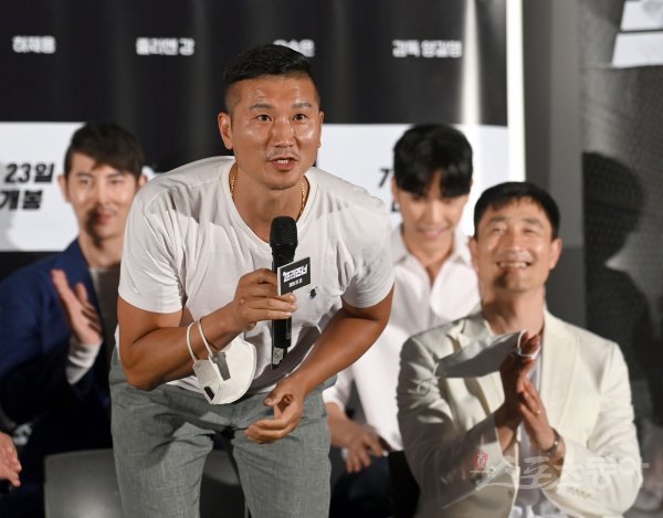 배우 장영진이 16일 서울 용산구 CGV 용산아이파크몰에서 열린 영화 ‘프리즈너’ 언론 배급 시사회에 참석해 인사말을 하고 있다.