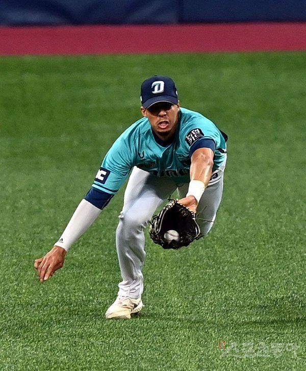 1회말 1사 1루에서 키움 이정후의 타구를 NC 알테어가 몸을 날려 잡아내고 있다.