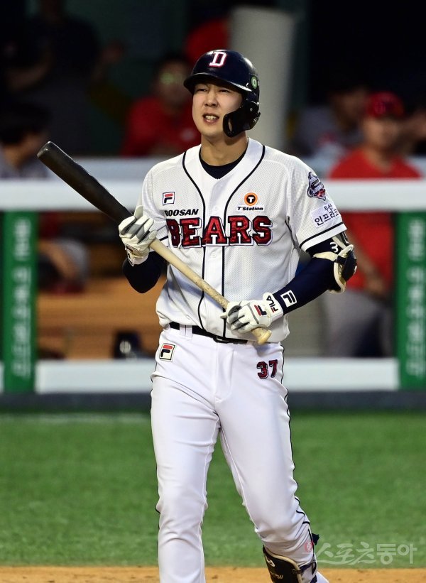 4회말 2사 두산 박건우가 삼진 아웃을 당하고 있다.