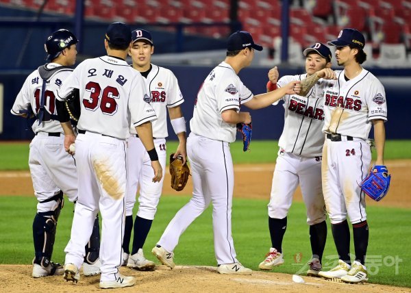 두산이 SK에 4-2로 승리를 거둔 뒤 선수들이 기쁨을 나누고 있다.