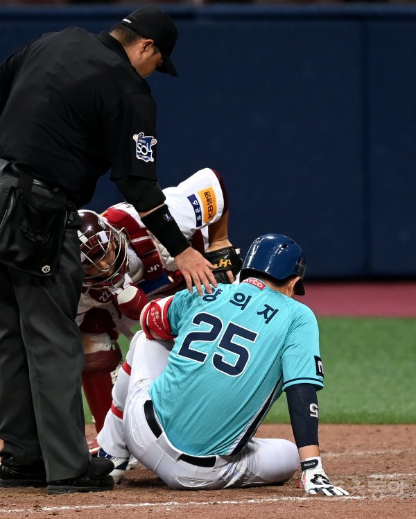 8회초 무사에서 NC 양의지가 NC 김선기의 볼에 맞은 뒤 그라운드에 앉아 있다.