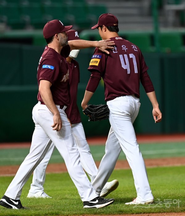 8회말 2사 만루에서 SK 대타 최항에게 2타점 동점 적시타를 허용한 키움 안우진이 교체되고 있다.