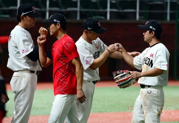 SK가 키움에 4-3으로 역전승을 거둔 뒤 박경완 감독 대행이 결승타를 기록한 김성현과 하이파이브를 나누고 있다.