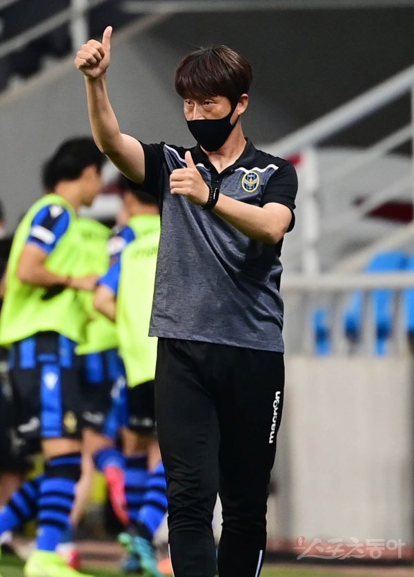 인천 임중용 감독대행이 선수들을 향해 엄지를 치켜세우고 있다.