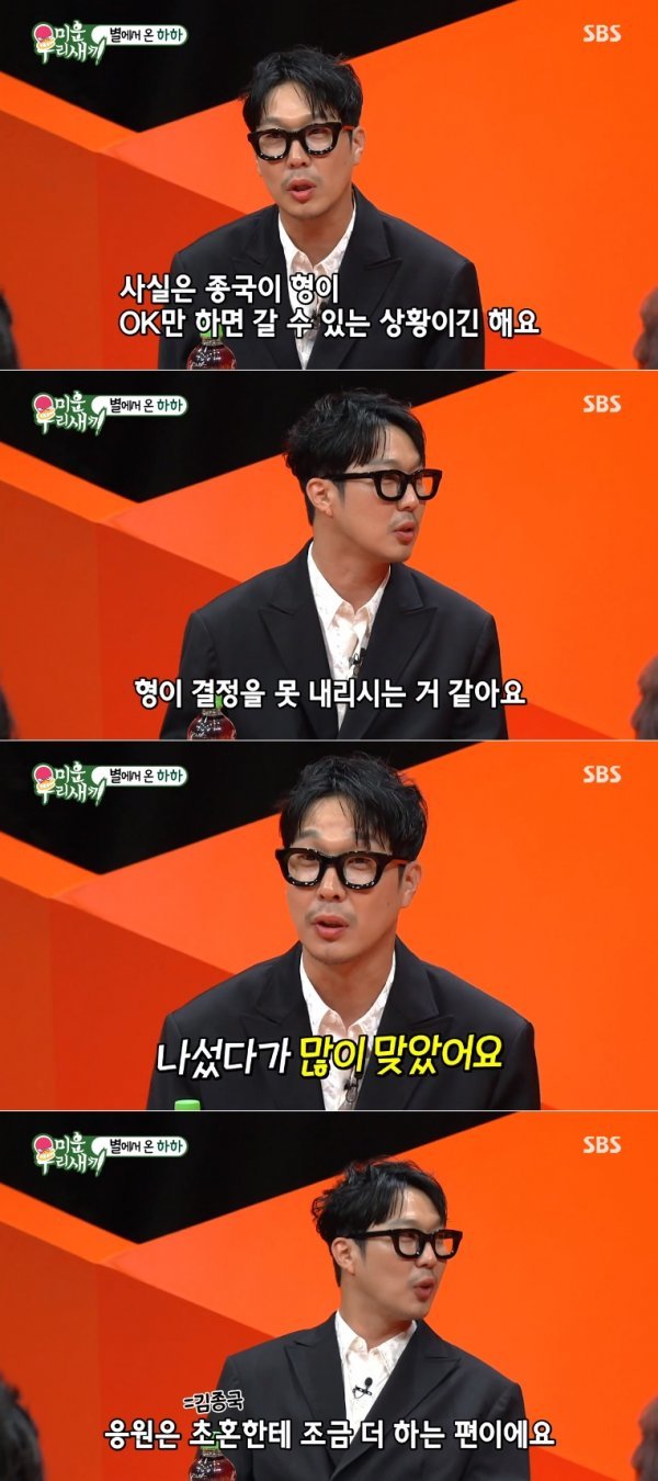 하하는 19일 밤 방송된 SBS ‘미운우리새끼’에서 김종국의 결혼 가능성에 대한 질문에 “김종국이 OK만 하면 갈 수 있는 상황”이라고 대답했다. 그는 “김종국을 호감 있게 보는 여성들이 많다. 그런데 형이 결정을 못 내리는 것 같다”고 말했다. “좀 나서봐라”는 말에 하하는 “나섰다가 많이 맞았다”고 농담했다.