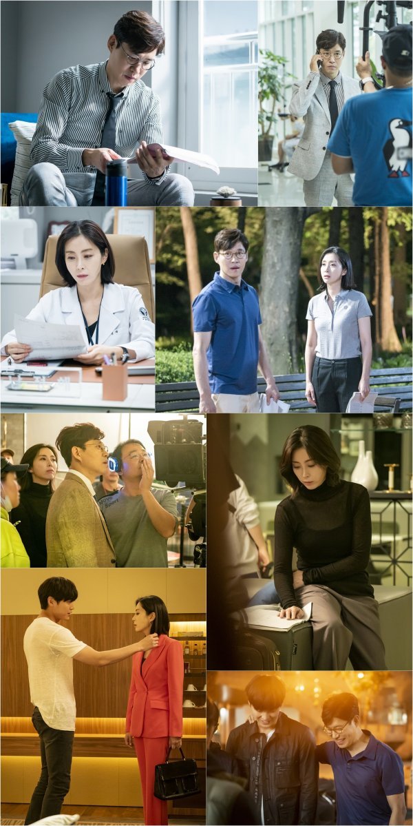 이날 공개된 비하인드 사진 속 배우들의 열연 모먼트가 다시 한번 ‘美친’ 텐션의 여운을 안긴다. 세상 남부러울 것 없는 ‘워너비’ 인생에서, 생애 최대 위기를 맞은 위태로운 중년으로 변화한 ‘안궁철’ 역의 유준상은 이미 캐릭터에 200% 몰입 중이다. 진지한 표정으로 대본에서 눈을 뗄 줄 모르는 그에게서 ‘하드캐리’ 열연의 비결이 짐작된다. 유준상, 송윤아는 ‘대본앓이’ 중인 모습마저 똑 닮았다. 때와 장소를 불문하고 대본 삼매경인 송윤아의 열공 모드도 눈길을 끈다. 주강산과의 악연, 안궁철과의 균열로 뒤엉킨 남정해의 불안한 심리와 내면의 혼돈을 세밀하게 보여준 그의 명품 연기는 ‘믿보배’의 진가를 다시금 확인시켰다.