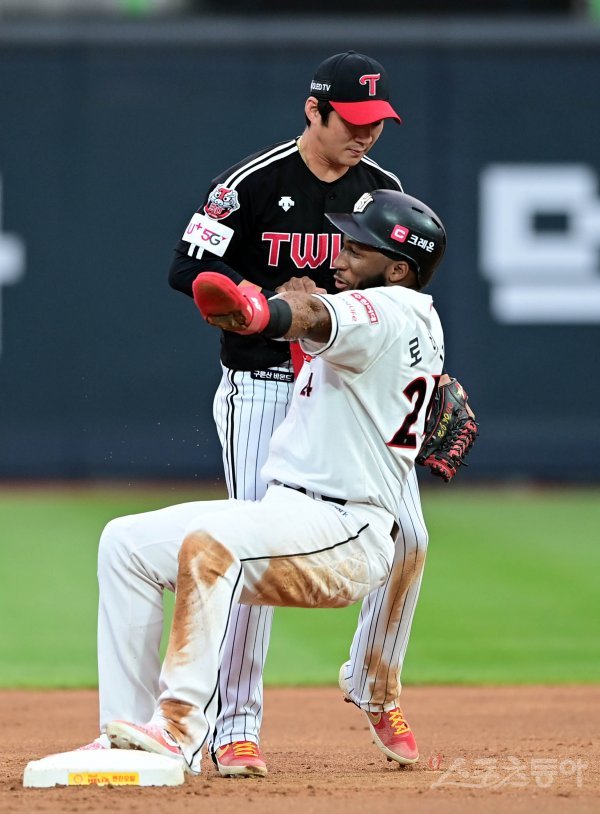 1회말 2사 1루 LG 강백호의 타석 때 1루주자 로하스가 2루로 도루를 시도해 세이프 되고 있다.
