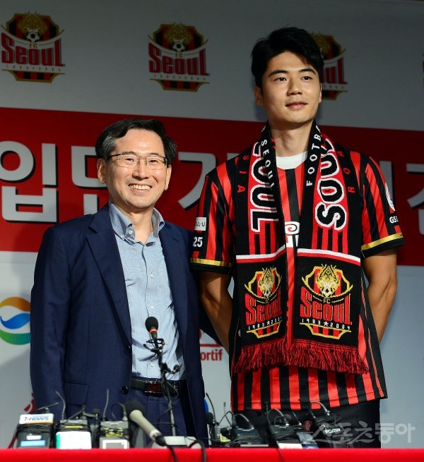 11년 만에 친정팀 FC 서울로 돌아온 기성용이 22일 서울 상암 서울월드컵경기장에서 입단식을 가졌다. 기성용이 등번호 8번 유니폼을 착용한 뒤 엄태진 사장과 기념촬영을 하고 있다.