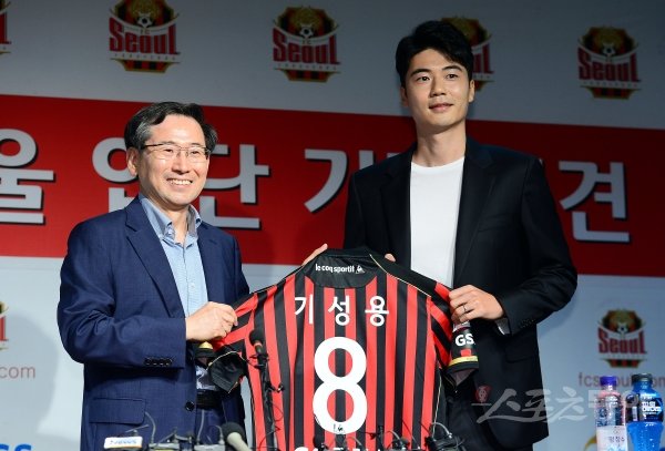 11년 만에 친정팀 FC 서울로 돌아온 기성용이 22일 서울 상암 서울월드컵경기장에서 입단식을 가졌다. 기성용이 등번호 8번 유니폼을 들고 엄태진 사장과 기념촬영을 하고 있다.