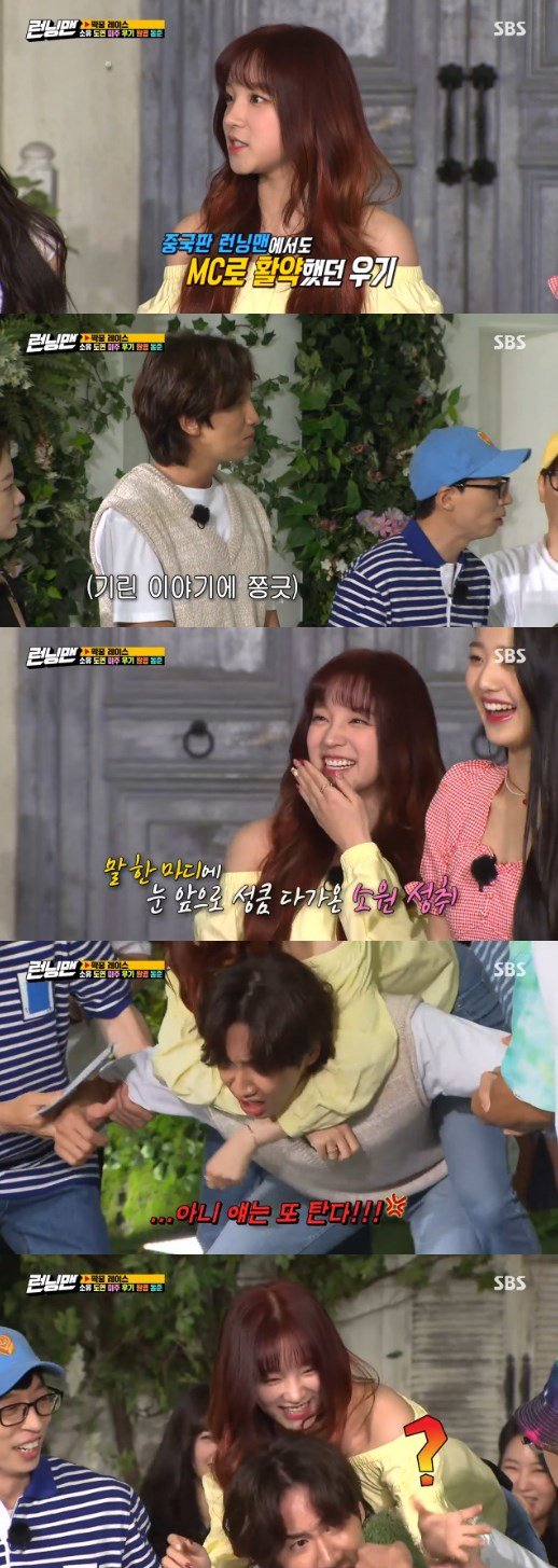(여자)아이들 우기가 기린을 타고 싶다는 말에 ‘런닝맨’ 멤버들이 이광수를 강제로 기린으로 변신시켰다.