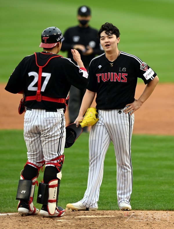 4회말 1사 1루 상황에서 LG 선발 이민호가 두산 최주환과 16구까지 가는 승부 끝에 볼넷으로 출루시킨 후 아쉬워하고 있다.