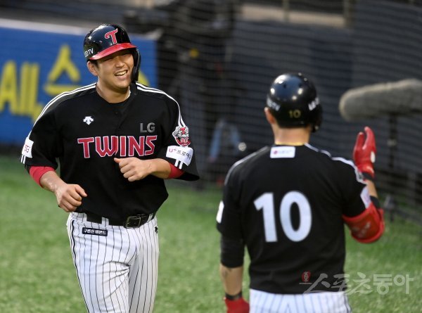 7회초 1사 1루 LG 3루타 때 1루루자 유강남이 득점에 성공한 후 밝게 웃고 있다.