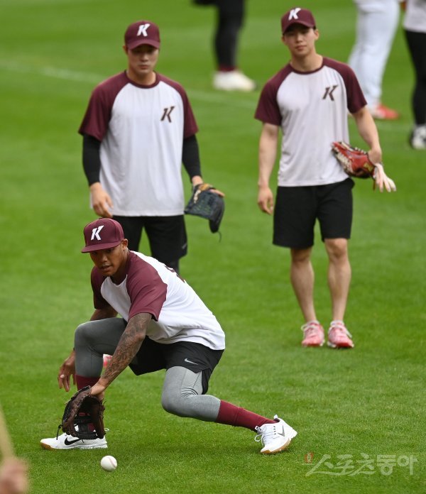 경기 전 키움 새 외국인 타자 러셀이 수비 훈련을 하고 있다.