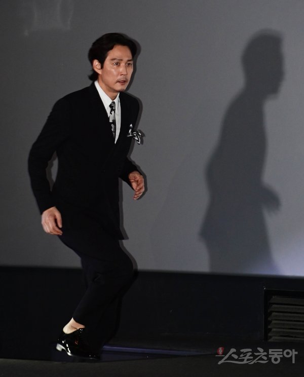 배우 이정재가 28일 서울 용산구 CGV 용산아이파크몰점에서 열린 영화 ‘다만 악에서 구하소서’ 언론시사회에서 무대에 오르고 있다.