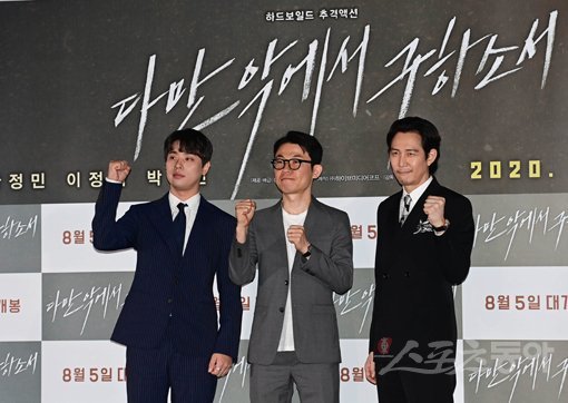 8월5일 개봉하는 영화 ‘다만 악에서 구하소서’의 주역인 배우 박정민과 연출자 홍원찬 감독, 이정재(왼쪽부터)가 28일 오후 서울 CGV용산아이파크몰에서 시사회를 열고 포즈를 취하고 있다. 또 다른 주연 황정민은 ‘교섭’의 요르단 로케로 현지에서 온라인 화상을 통해 인사를 전했다.