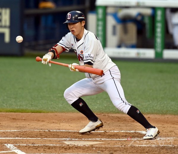 2회말 1사 1루 두산 정수빈이 기습 번트로 안타를 만들고 있다.