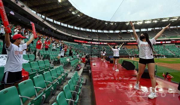 정부의 프로 스포츠 관중 입장 허용 발표에 따라 경기장 수용 인원의 10%까지 관중 입장이 허용된 가운데 야구팬들이 응원을 펼치고 있다.