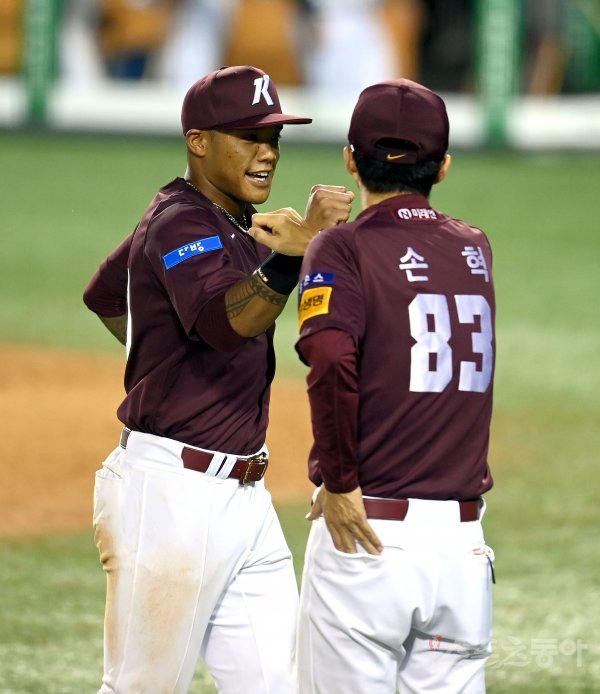 키움이 6-2 승리를 거두며 2연승을 달렸다. 경기 종료 후 키움 러설이 감독과 하이파이브 하고 있다.
