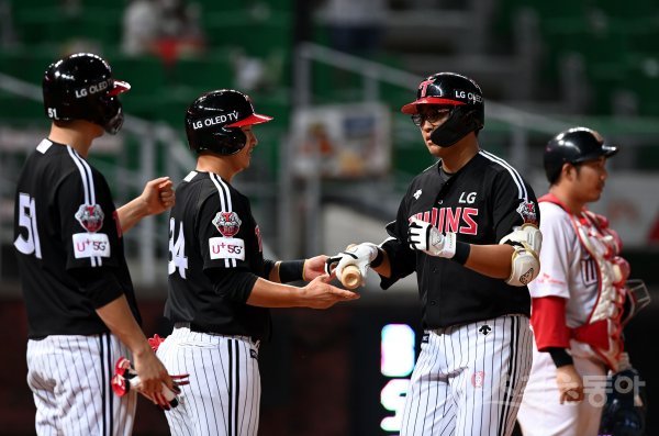 9회초 2사 만루에서 LG 채은성이 만루 홈런을 쏘아 올린 뒤 동료들의 환영을 받고 있다.