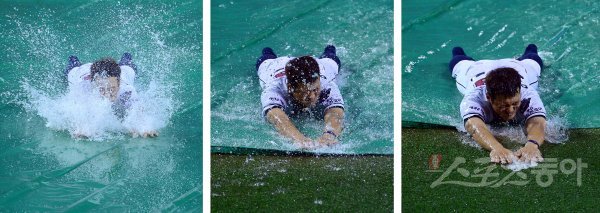 29일 서울 잠실야구장에서 ‘2020 신한은행 SOL KBO 리그’ 키움 히어로즈와 두산 베어스의 경기가 열렸다. 1회말 1사 상황에서 우천으로 인하여 노게임 선언됐다. 두산 안권수가 우천 세리머니를 하고 있다. 잠실 | 김종원 기자 won@donga.com