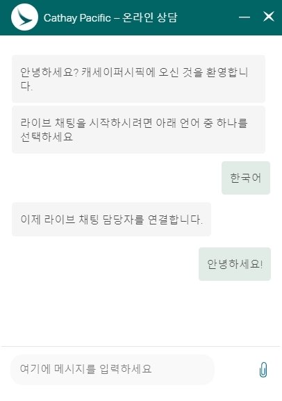 ‘라이브 채팅’은 캐세이퍼시픽 한국 지사의 예약부 직원이 담당하며, 고객 문의에 실시간 채팅 형식으로 상담을 제공한다. 항공편 예약, 운항정보, 탑승시간 등 항공 이용 전 과정의 문의 사항에 대해 상담을 받아 볼 수 있다. 캐세이퍼시픽은 한국 시장의 중요성을 강조하며 한국 고객들의 이용 편의성을 높이기 위해 한국어 서비스를 추가했다고 설명했다.