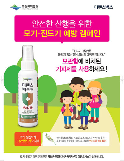 동국제약(대표이사 오흥주)은 국립공원공단과 함께 ‘모기·진드기 예방 캠페인’을 10월까지 진행한다. 전국 국립공원 주요 등산로에 모기·털진드기·살인진드기 기피제인 ‘디펜스벅스더블’을 탐방객들이 직접 사용할 수 있는 체험존도 운영한다.