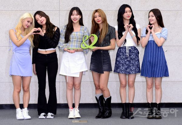 모모랜드 아인(왼쪽부터), 주이, 나윤, 혜빈, 제인, 낸시가 여성 생리대 세트 1,500팩을 기부하며 카메라를 향해 포즈를 취하고 있다.