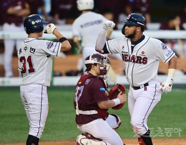 30일 서울 잠실야구장에서 ‘2020 신한은행 SOL KBO리그’ 두산 베어스와 키움 히어로즈의 경기가 열렸다. 3회말 2사 1루 두산 페르난데스가 우월 2점 홈런을 날린 뒤 정수빈과 기쁨을 나누고 있다. 잠실 | 주현희 기자 teth1147@donga.com