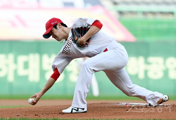30일 인천 SK행복드림구장에서 ‘2020 신한은행 SOL KBO리그’ SK 와이번스와 LG 트윈스의 경기가 열렸다. SK 선발투수 박종훈이 힘차게 볼을 던지고 있다. 인천 | 김민성 기자 marineboy@donga.com
