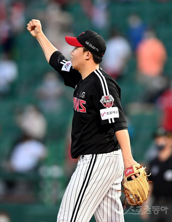 30일 인천 SK행복드림구장에서 ‘2020 신한은행 SOL KBO리그’ SK 와이번스와 LG 트윈스의 경기가 열렸다. 4회말 1사에서 SK 채태인의 타구를 LG 3루수 김민성이 호수비로 아웃시키자 선발 임찬규가 주먹을 쥐며 환호하고 있다. 인천 | 김민성 기자 marineboy@donga.com