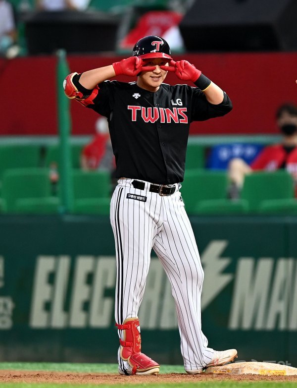 30일 인천 SK행복드림구장에서 ‘2020 신한은행 SOL KBO리그’ SK 와이번스와 LG 트윈스의 경기가 열렸다. 5회초 1사 2루에서 LG 김호은이 1타점 적시타를 날린 뒤 세리머니를 펼치고 있다. 인천 | 김민성 기자 marineboy@donga.com