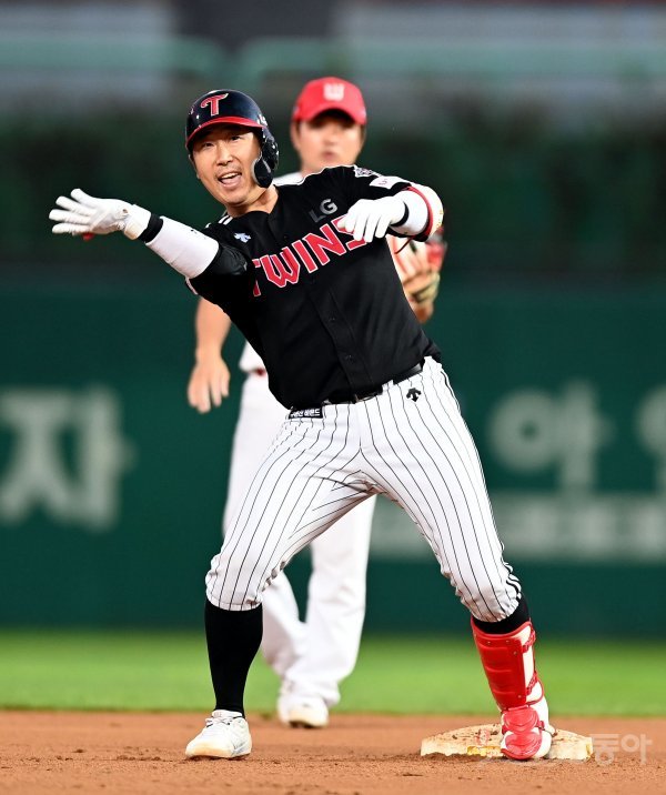 30일 인천 SK행복드림구장에서 ‘2020 신한은행 SOL KBO리그’ SK 와이번스와 LG 트윈스의 경기가 열렸다. 5회초 1사 2루에서 LG 이성우가 1타점 2루타를 날린 뒤 세리머니를 펼치고 있다. 인천 | 김민성 기자 marineboy@donga.com