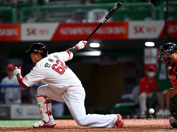 5회말 2사 2, 3루에서 SK 한동민이 스트라이크 낫아웃을 당하고 있다.