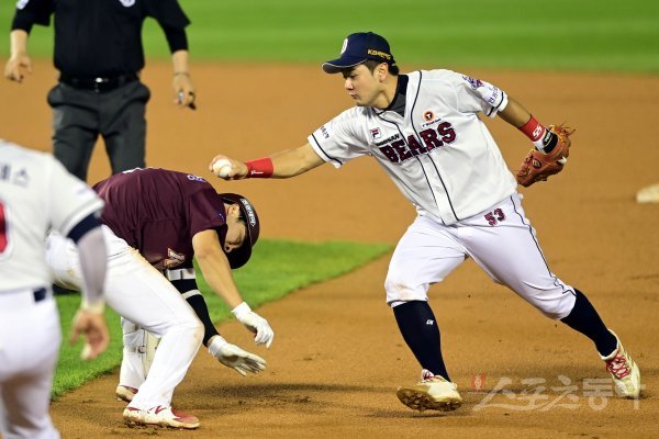 6회초 1사 1루 키움 김하성이 좌전 안타 때 2루로 향하던 중 런다운에 걸려 두산 2루수 최주환에게 태그 아웃되고 있다.