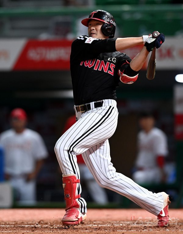 7회초 2사 1, 3루에서 LG 이형종이 1타점 2루타를 날리고 있다.